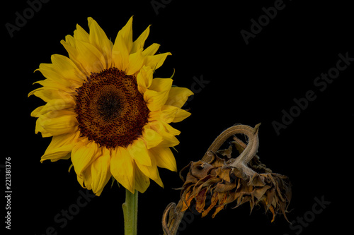 Naklejka premium The young and the old - two sunflowers one old and wrinkled and one young and...