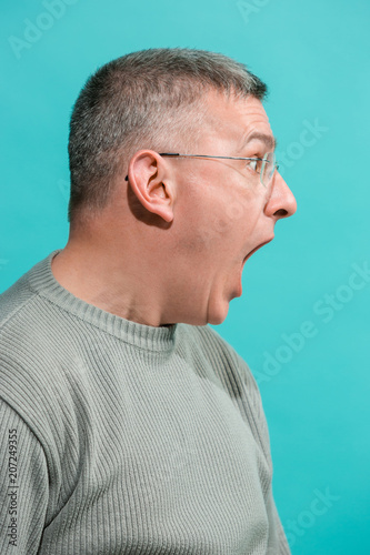 © master1305, Obraz premium The young attractive man looking suprised isolated on blue