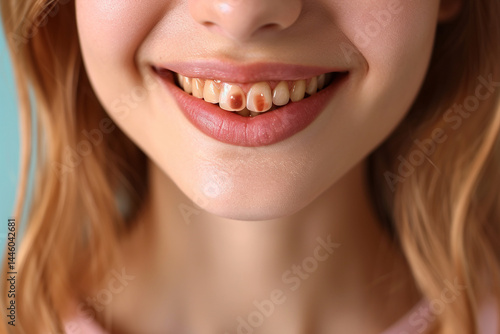 Obraz premium THE young Caucasian womans close up photo reveals her inflamed gums on lovely...