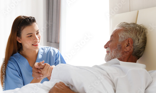 © atitaph, Obraz premium The young doctor held the hand of an old Caucasian man to take care of him. Talk to him from his illness lying in bed in his bedroom