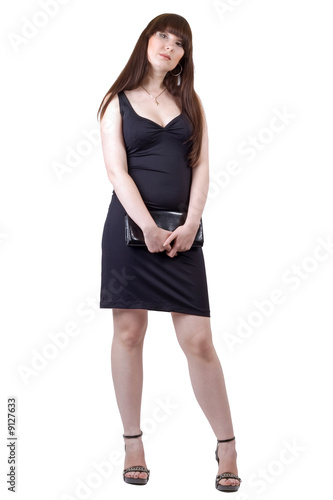 Fototapeta premium The young woman with a handbag in a black dress. Isolated