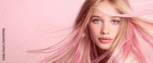 © Dmy, Fototapeta premium The young woman with flowing pink hair and captivating blue eyes.