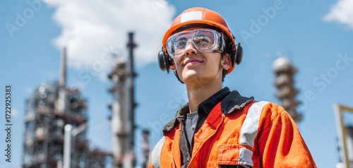 Naklejka premium The young worker in safety gear smiles confidently at the industrial site.