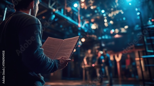 Fototapeta premium Theater Stage Manager Reads Play Script Backstage Lights