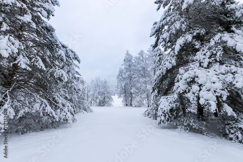 © Sergei, Fototapeta premium Theatrical winter composition. Classic composition of trees with three plans.