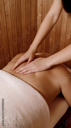 © Siasart Stock, Fototapeta premium Therapist Gives Relaxing Back Massage in Wooden Sauna Room with Soft Lighting Gently