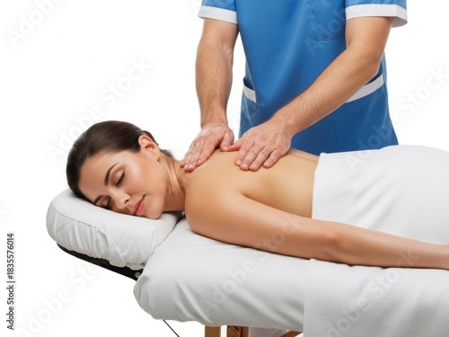 © Galib, Fototapeta premium Therapist giving a relaxing shoulder massage to a woman isolated on white background