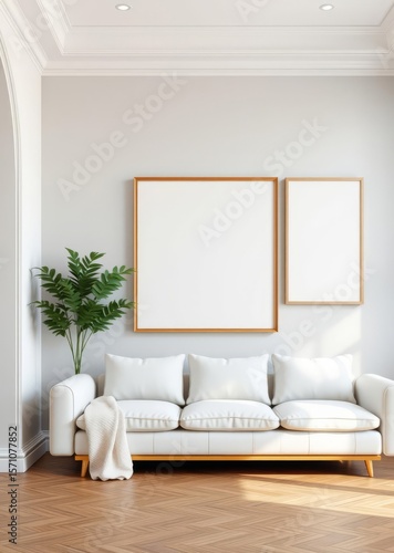 © Creative Canvas, Fototapeta premium There are empty photo frames on the living room wall an interior design illustration mockup template and an empty poster frame mockup template Empty room interior design Ultra realistic Photoreal