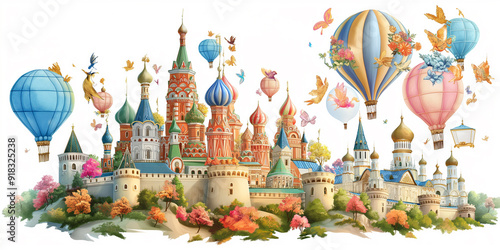 © PNG Pix, Fototapeta premium there are many balloons flying over a castle with a lot of trees