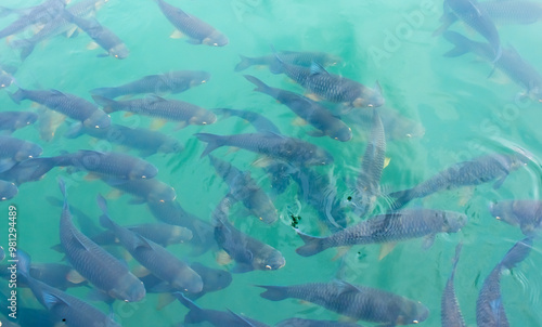 Fototapeta premium There are many Japanese carp fish swimming in the water. Fish farm. The pond is teeming with a school of large fish.