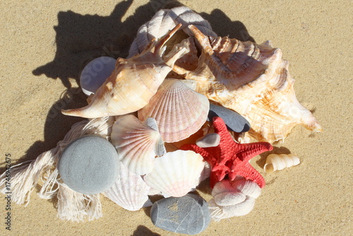 © DENIS , Obraz premium There are many sea shells and stones on the yellow sand.