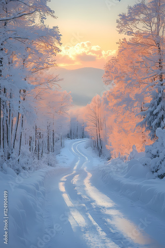 Naklejka premium There is a beautiful sunrise surrounded by white trees and a pastel sky. Perfect for winter travel photography, the scene is peaceful and serene.