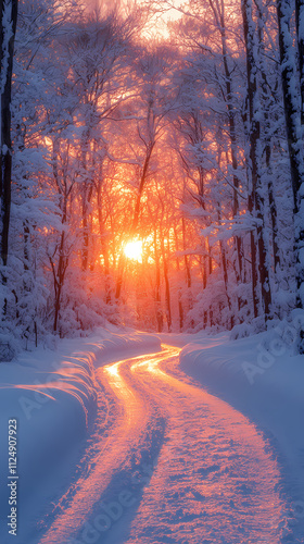 © Akharadat, Naklejka premium There is a beautiful sunrise surrounded by white trees and a pastel sky. Perfect for winter travel photography, the scene is peaceful and serene.