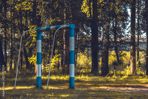 © Ihar, Fototapeta premium There is a blue and white soccer goal positioned in the middle of a dense forest