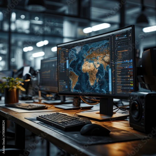 © RoyalMotion, Fototapeta premium There is a computer on a desk in a room with a view of the city