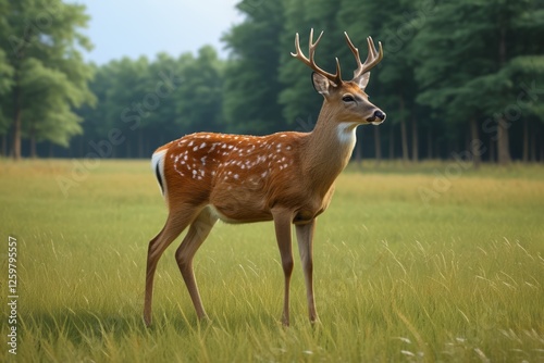 © haiqiang, Fototapeta premium there is a deer that is standing in the grass in the field