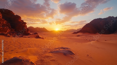 © Tilak, Naklejka premium There is a desert where only sand is visible all around and the sky is blue and light cloudy, the view is very beautiful. desert background.