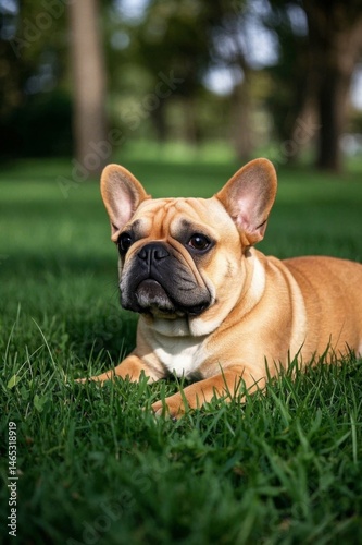 © haiqiang, Fototapeta premium there is a dog that is laying in the grass with a frisbee