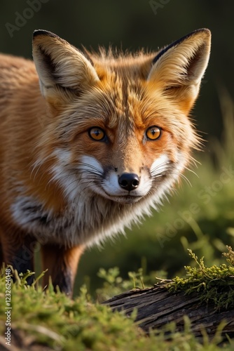 © haiqiang, Obraz premium there is a fox that is standing in the grass looking at the camera