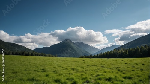 © haiqiang, Fototapeta premium there is a large field of grass with mountains in the background