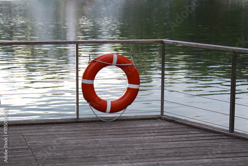 Fototapeta premium There is a lifebuoy hanging on the fence at the pier near the reservoir.