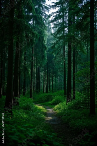 © haiqiang, Obraz premium there is a path in the middle of a forest with tall trees