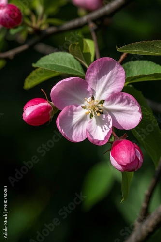 © haiqiang, Obraz premium there is a pink flower on a tree branch with green leaves