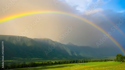 © rasel, Naklejka premium there is a rainbow that appears to be coming out of the sky over a mountain
