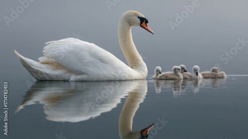 © Imron, Naklejka premium there is a serene scene of wildlife set against a misty background. a family of swans is prominently featured, floating peacefully on a calm body of water