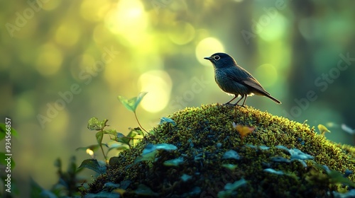 © Thanthara, Obraz premium there is a small bird sitting on top of a moss covered hill
