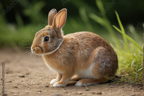 © haiqiang, Fototapeta premium there is a small rabbit sitting on the ground in the dirt