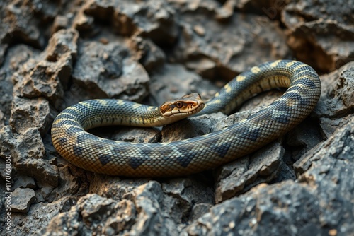 © haiqiang, Fototapeta premium there is a snake that is laying on the rocks