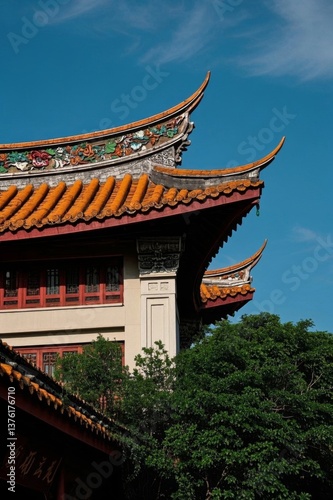 © haiqiang, Obraz premium there is a tall building with a red roof and a clock on it