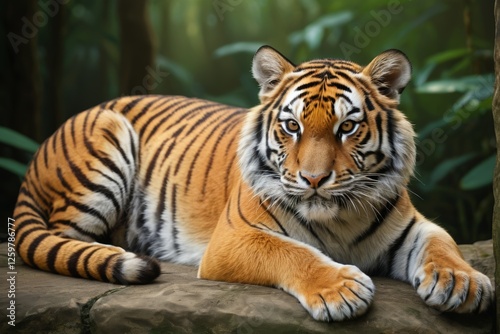 © haiqiang, Fototapeta premium there is a tiger that is laying down on a rock