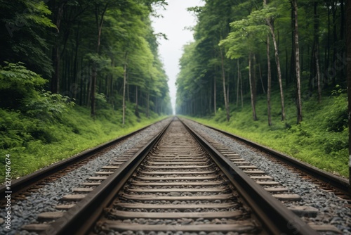 © haiqiang, Fototapeta premium there is a train track that is going through the woods