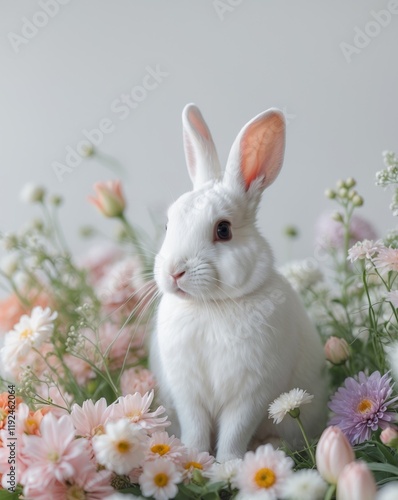 Obraz premium there is a white rabbit sitting next to a bunch of flowers