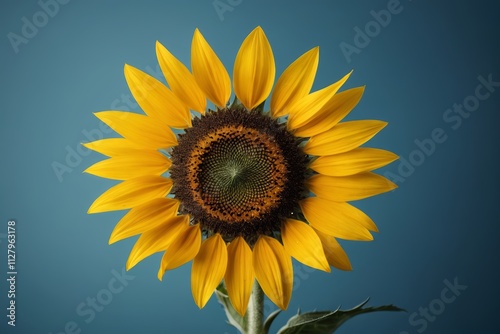 © haiqiang, Obraz premium there is a yellow sunflower with a green center on a blue background