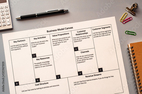 © hogehoge511, Obraz premium There is dummy documents that created for the photo shoot on the desk about Business Model Canvas.