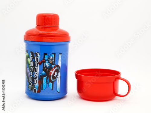 Naklejka premium Thermos for children's drinks. Plastic bottle with glass included. School supplies. Spider-Man. Avengers Assemble. Captain America. Toy. Comic. Movies. Peter parker. Superheroe. Super heroes.