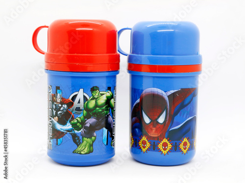 Naklejka premium Thermos for children's drinks. Plastic bottle with glass included. School supplies. Spider-Man. Avengers Assemble. Thor. Hulk. Spider man. Toy. Comic. Movies. Peter parker. Superhero. Super heros.