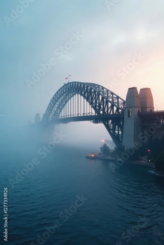 © Sathaporn Buarabut, Naklejka premium Thick fog veils Sydney Harbour Bridge landscape, fog, mist