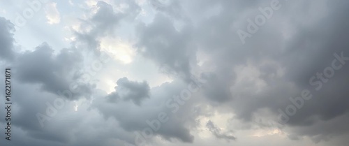Fototapeta premium Thick, grey clouds blanket the sky, muted light diffuses evenly, clouds, overcast sky