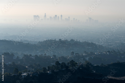© trekandphoto, Fototapeta premium Thick hazy layer of smog and smoke from nearby brush fire clouding the view of downtown Los Angeles buildings in Southern California. Shot from hilltop in popular Griffith Park.
