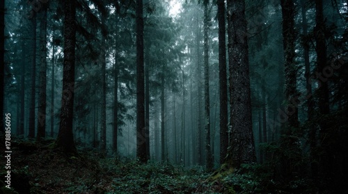 Obraz premium Thick mist hangs in a tranquil forest filled with towering trees creating a...