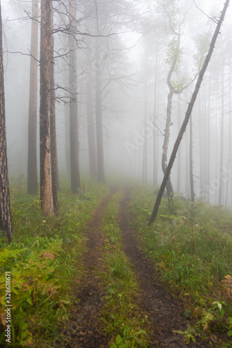 Naklejka premium thick misterious fog in forest, mystical dirt road in haze, smoke from fire...
