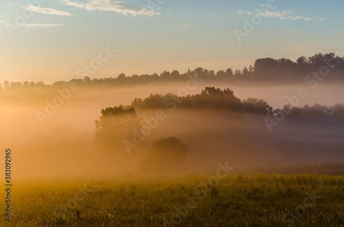 Fototapeta premium Thick mystical fog over a green forest. Juicy grass.