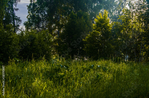 Fototapeta premium Thick mystical fog over a green forest. Juicy grass.