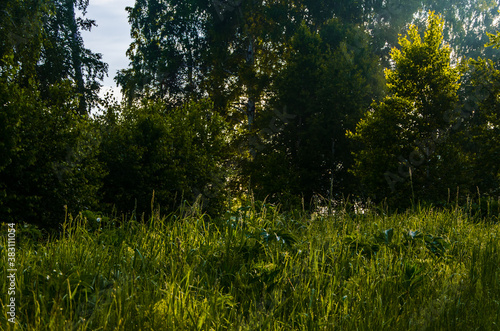 Fototapeta premium Thick mystical fog over a green forest. Juicy grass.