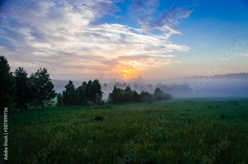 © efimenkoalex, Obraz premium Thick mystical fog over a green forest. Juicy grass.