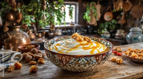 © Uni, Naklejka premium Thick Suzme Yogurt With Honey And Walnuts, Turkish Food Menu Photography